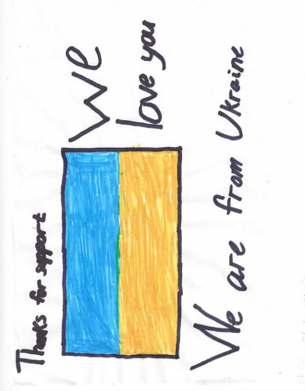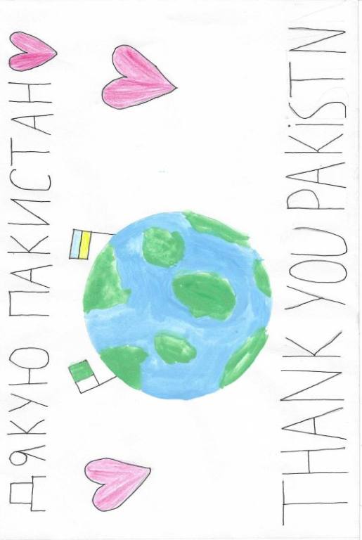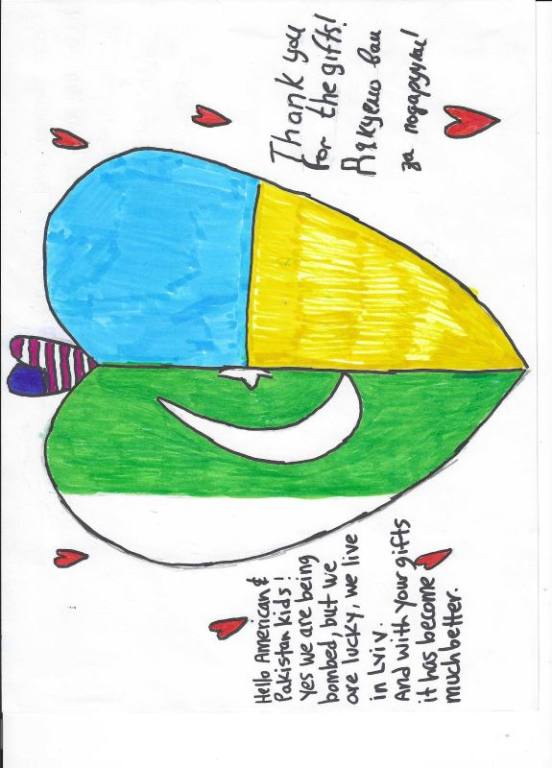 | | Hello American and Pakistan kids! Yes we are being bombed, but we are lucky, we live in Lviv. And with your gifts, it has become much better.