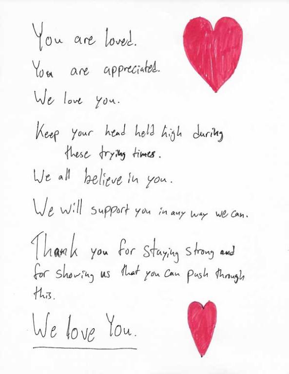 May God bless you and bring you ease in your future. The sun will shine again. | | Stay Strong | | You are loved. You are appreciated. We love you. Keep your head held high during these trying times. We all believe in you. We will support you in any way we can. Thank you for staying strong and for showing us that you can push through this. We love you. |